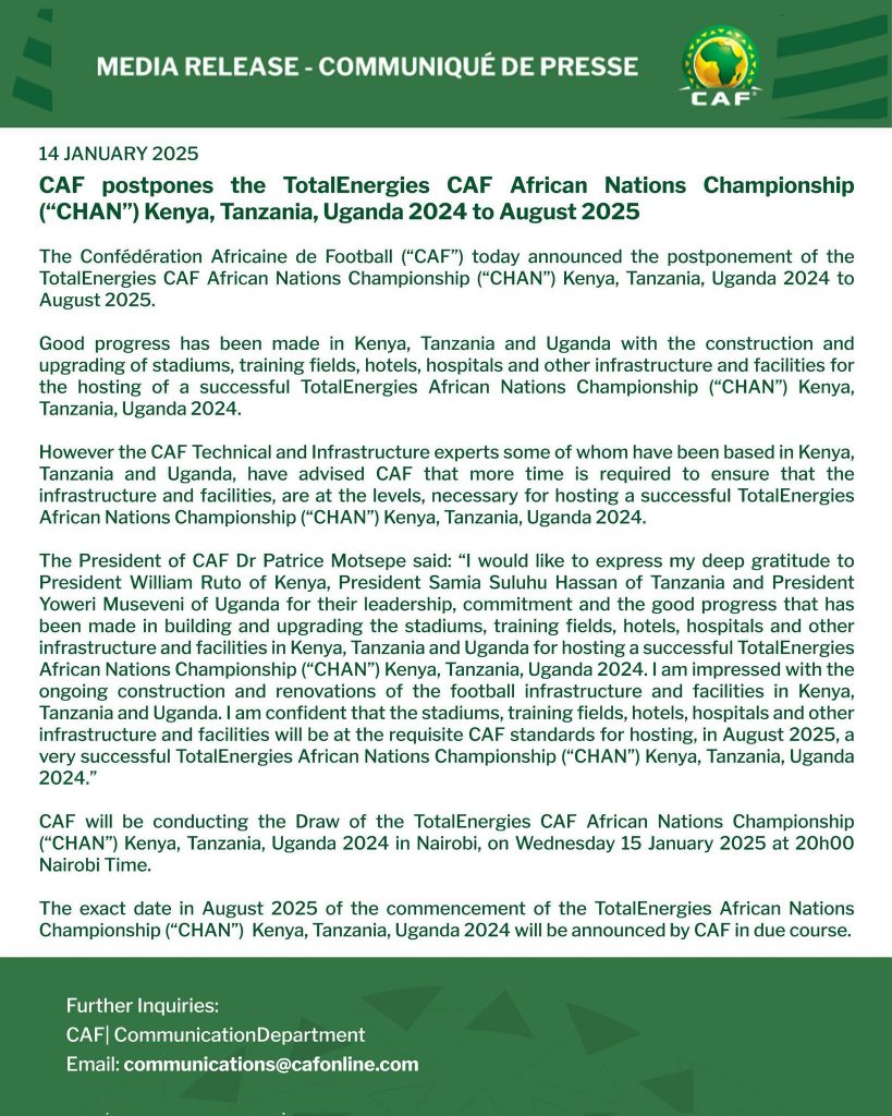 CAF has announced the postponement of the 2024 CHAN tournament to August 2025. However, the draw for the tournament that caters to locally based players will go ahead as planned.
