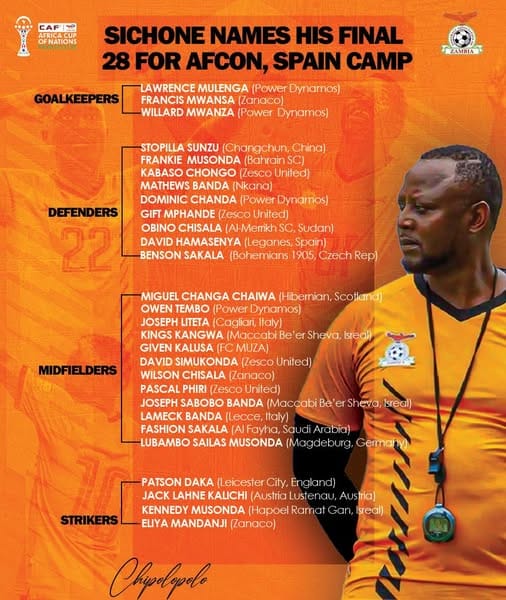 Zambia head coach Moses Sichone has officially unveiled his 28-man squad for the 2025 Africa Cup of Nations in Morocco, narrowing down from an initial provisional list of 55 players.