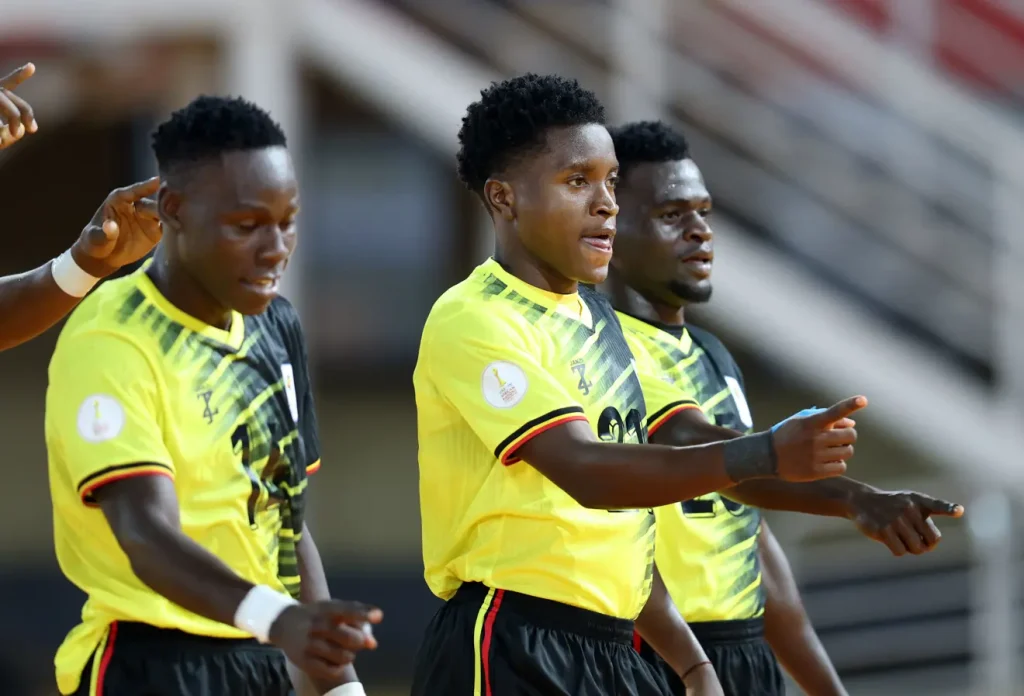 Uganda players celebrate the opening goal against Niger